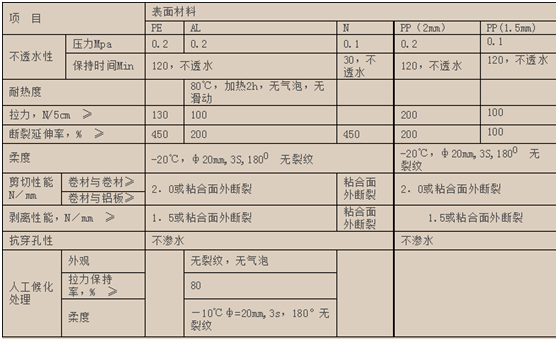 注:上表面材料为PP膜时,执行Q/ICJE16-2005标准
