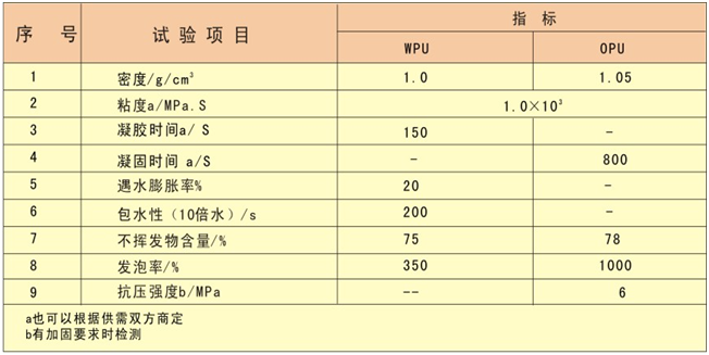 产品为单组分。使用时不需要加入溶剂和助剂,使用效果与水溶性聚氨酯相同。使用方便、止水效果好,不会燃烧,能安全运输、保管和使用。 |