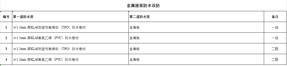 说明:1 防水涂料或防水卷材厚度指单道防水层最小厚度;2 当采用溶剂型聚氨酯防水涂料与沥青防水卷材相邻设防时,宜设置 20mm 厚 M15 的水泥砂浆隔离层,其他设计方案同;3 耐根穿刺防水卷材的施工方法应与耐根穿刺检测报告中注明的施工方法一致;4 粘结材料与防水卷材共同形成复合防水层时,应单独对粘结材料进行检测,确保合格;5 金属板包括压型金属板和金属面夹芯板。当前金属屋面工程中大多选用合成高分