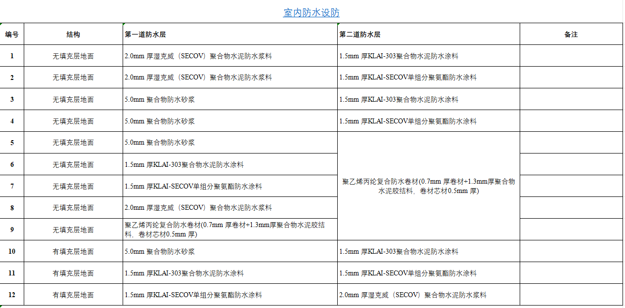 说明:1 防水涂料或防水卷材厚度指单道防水层最小厚度;2 室内工程一级设防,规定防水设防道数不应少于2道,其中防水卷材或防水涂料不应少于1道,主要是考虑到卷材质量的可控以及防水涂料在处理管根、地漏等节点时的便捷,亦可适应基层变形带来的影响;3 用水空间与非用水空间楼地面交接处应有防止水流入非用水房间的措施。淋浴区墙面防水层翻起高度不应小于2000mm,且不低于淋浴喷淋口高度。盥洗池盆等用水处墙面防