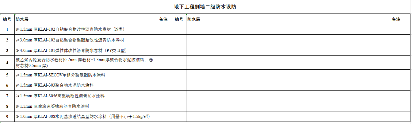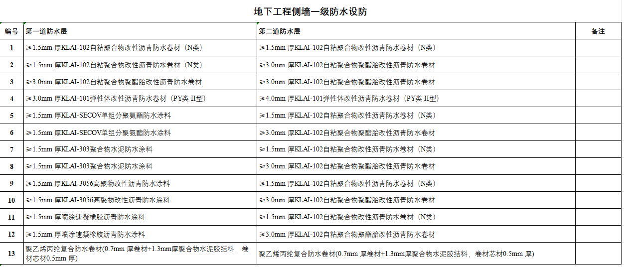 说明:1 防水涂料或防水卷材厚度指单道防水层最小厚度;2 当采用溶剂型聚氨酯防水涂料与沥青防水卷材相邻设防时,宜设置 20mm 厚 M15 的水泥砂浆隔离层,其他设计方案同;3 耐根穿刺防水卷材的施工方法应与耐根穿刺检测报告中注明的施工方法一致;4 粘结材料与防水卷材共同形成复合防水层时,应单独对粘结材料进行检测,确保合格;5 当聚乙烯丙纶复合防水卷材、聚乙烯丙纶耐根穿刺复合防水卷材采用水泥基材料