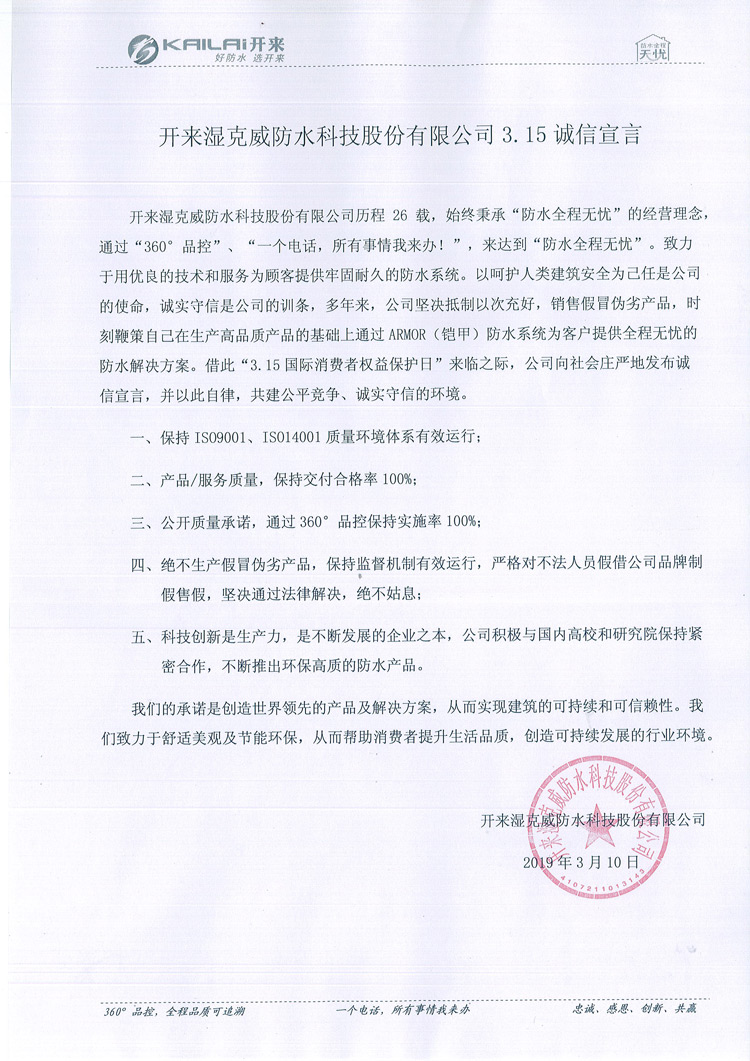 开来湿克威防水科技股份有限公司历程26载,始终秉承“防水全程无忧”的经营理念,通过“360°品控”、“一个电话,所有事情我来办!”,来达到“防水全程无忧”。致力于用优良的技术和服务为顾客提供牢固耐久的防水系统。以呵护人类建筑安全为己任是公司的使命,诚实守信是公司的训条,多年来,公司坚决抵制以次充好,销售假冒伪劣产品,时刻鞭策自己在生产高品质产品的基础上通过ARMOR(铠甲)防水系统为客户提供全程无忧的防水解决方案。借此“3.15国际消费者权益保护日”来临之际,公司向社会庄严地发布诚信宣言,并以此自律,共建公平竞争、诚实守信的环境。