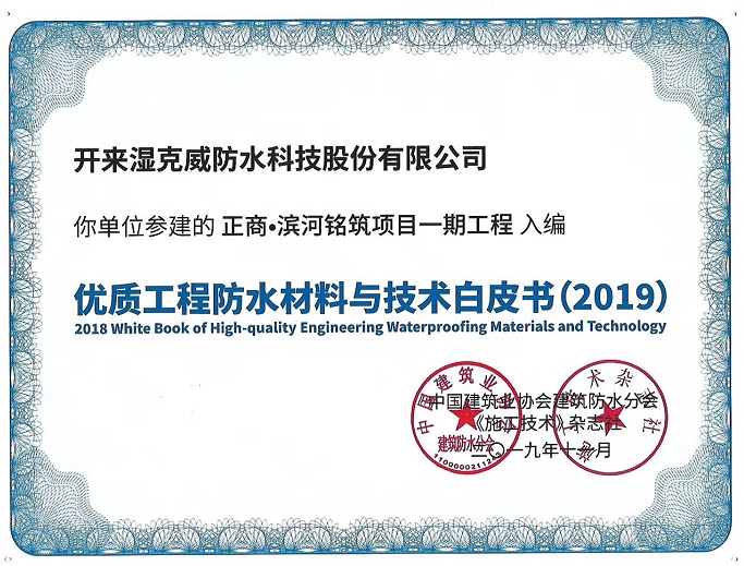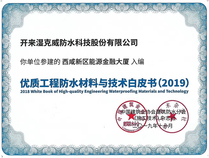 开来湿克威防水科技股份有限公司参建的西咸新区能源金融大厦、正商▪滨河铭筑一期工程等优质工程项目入选。