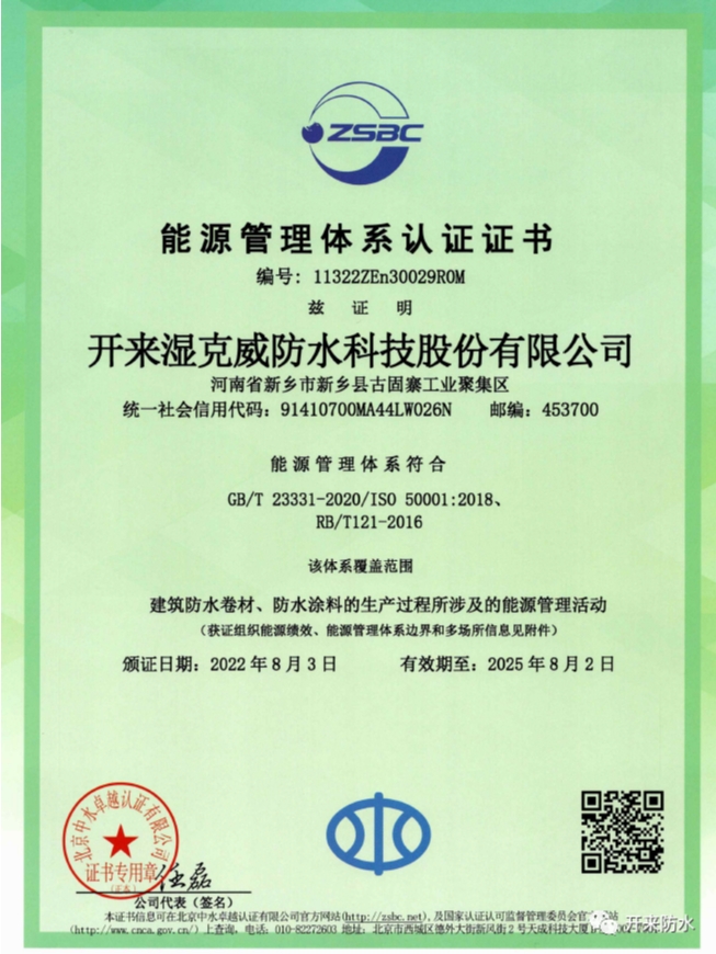 公司通过近一年的积极筹备,在低碳节能方面,通过多种途径,降低能耗,发展绿色产品之路,实现供销存财的协同发展。经过北京中水卓越认证有限公司的审核,于2022年8月3日获得《能源管理体系认证证书》。该证书的获得,是继知识产权管理体系、两化融合管理体系认证之后,又一个标志性的认证,标志着开来湿克威防水科技股份有限公司向绿色低碳发展的方向上又进了一步。