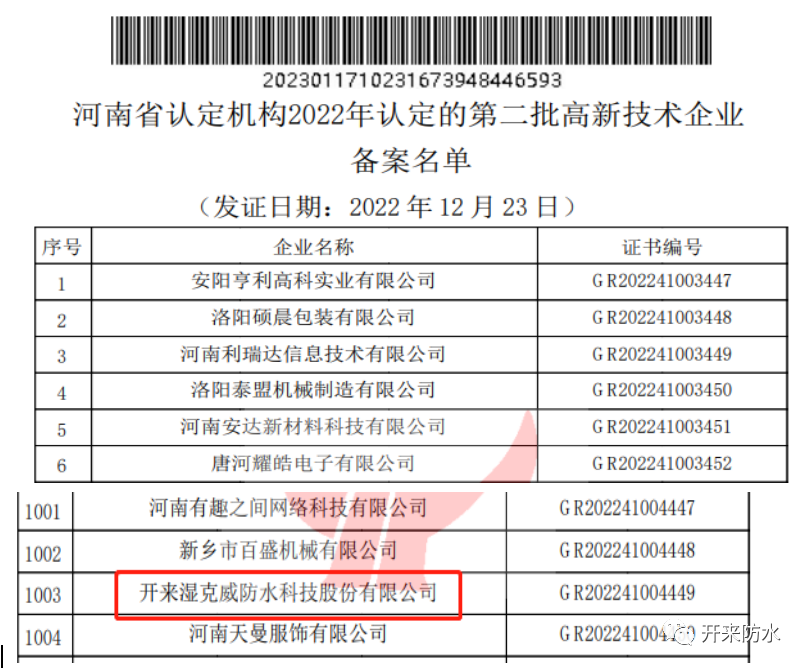 近日,开来湿克威防水科技股份有限公司顺利通过《高新技术企业认定管理办法》(国科发火字〔2016〕32号)和《国家高新技术企业认定管理工作指引》(国科发火字〔2016〕195号)有关规定,在科技部火炬高技术产业开发中心于关于对河南省认定机构2022年认定的第二批高新技术企业进行备案的公示名单中,开来湿克威防水科技股份有限公司正式被评定为国家级高新技术企业!