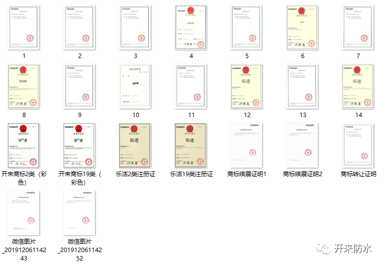 开来实施品牌战略,不断提升品牌形象,4个注册商标分别用于工程装系列防水材料、家装系列防水材料、定制系列防水材料以及特种系列防水材料的应用,品牌群落知名度在业内迅速提高。