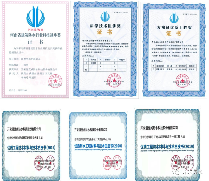 公司开展的研发多项成果获得行业领域的高度评价,其中“阻燃型彩色沥青瓦”成果荣获河南省建筑防水协会2021年度科技进步一等奖;“金属屋面防水修缮系统”获得河南省建筑防水协会颁发的科技进步奖一等奖,“郑州市岗李合村并城改造项目(一期安置区)地下防水工程”成果荣获河南省建筑防水协会“大豫杯”优质工程奖,西咸新区能源金融大厦、华为新乡云计算数据中心、正商·滨河铭筑一期工程分别入选中国建筑业协会建筑防水分会和建筑施工技术杂志社办法的优质工程防水材料与技术白皮书。开来湿克威的知名度和行业影响力得到快速提升。