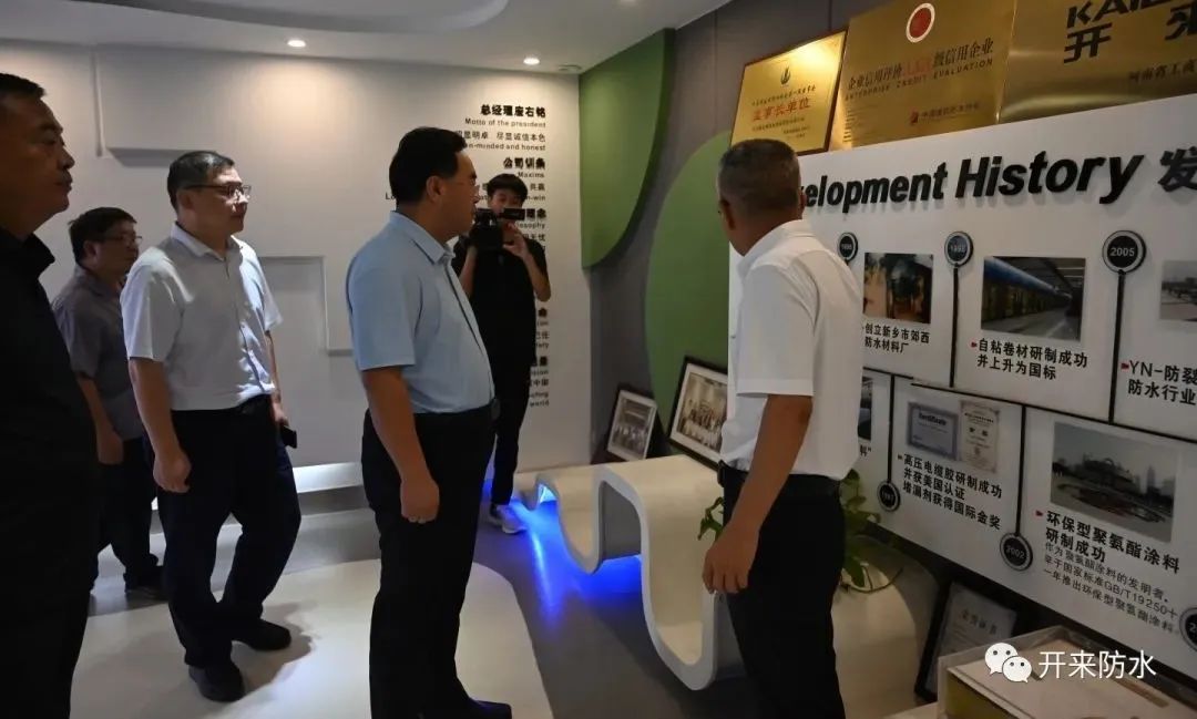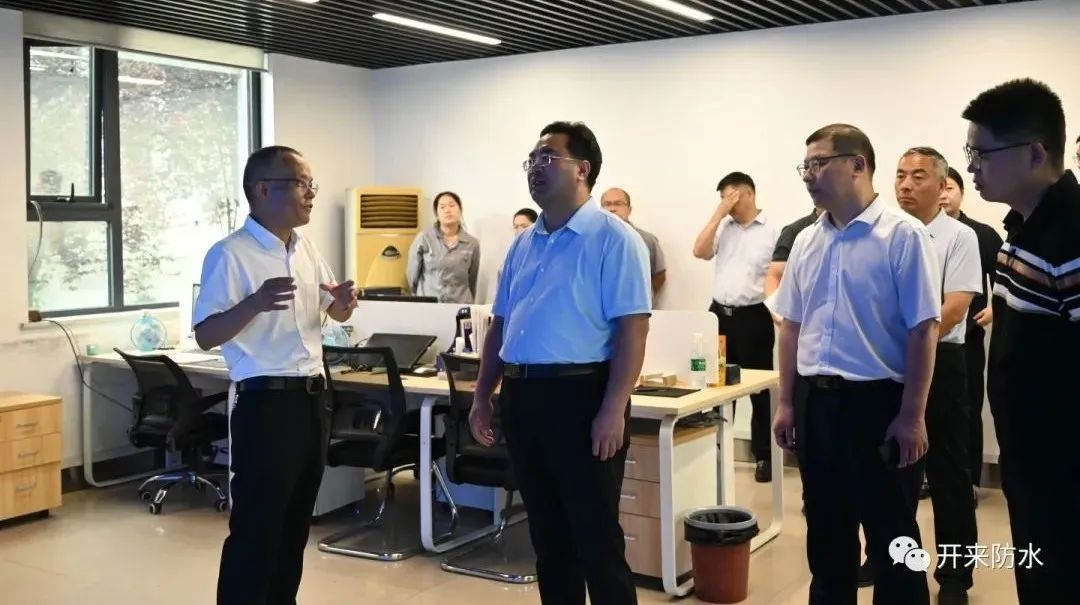 8月8日上午,新乡县委书记祝显成带队到开来湿克威防水调研,县委办主任、开发区管委会主任王明辉,科工局局长王帅、农业农村局局长张罡、古固寨镇党委书记王宗源、镇长张莉等一行陪同。