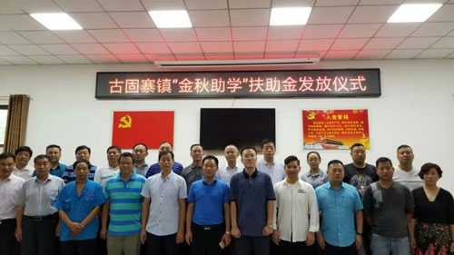 近日,开来集团董事长倪贵全参加了在古固寨镇史屯村委会会议室举行的“金秋助学”扶助金发放仪式,出席本次会议的人员还有古固寨镇党委书记杨牧、镇长范晓哲、镇党委副书记、人大主席杨荣华、政府常务副镇长高黎伟、镇党委委员张梅、著名歌手冷漠及其他企业家、各界爱心人士。