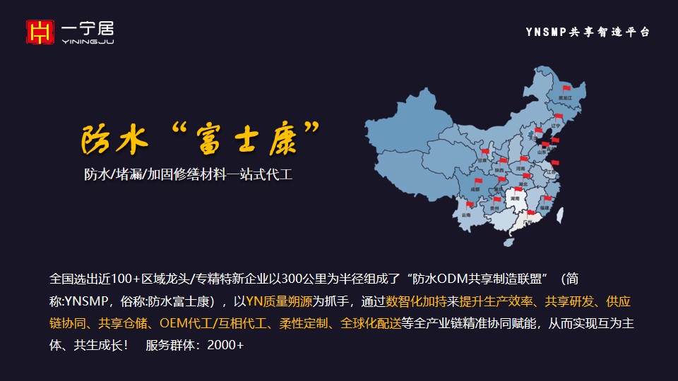 全国选出近100+区域龙头/专精特新企业以300公里为半径组成了“防水ODM共享制造联盟”(简称:YNSMP,俗称:防水富士康),以YN质量朔源为抓手,通过数智化加持来提升生产效率、共享研发、供应链协同、共享仓储、OEM代工/互相代工、柔性定制、全球化配送等全产业链精准协同赋能,从而实现互为主体、共生成长! 服务群体:2000+